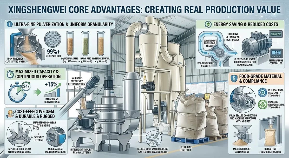 Tiết kiệm năng lượng và giảm chi phí: Xingshengwei tối ưu hóa độc quyền thiết kế ống dẫn khí và buồng nghiền điện trở thấp, giảm đáng kể mức tiêu thụ năng lượng trên mỗi tấn nghiền thức ăn và trực tiếp giảm chi phí điện hàng tháng. Ghế ổ trục sử dụng hệ thống làm mát làm mát bằng nước vòng kín để tránh quá nhiệt khi hoạt động cường độ cao trong thời gian dài, kéo dài hơn nữa tuổi thọ của các bộ phận cốt lõi của toàn bộ máy, giảm tần suất ngừng hoạt động ngoài kế hoạch và cải thiện tốc độ vận hành chung của dây chuyền sản xuất.