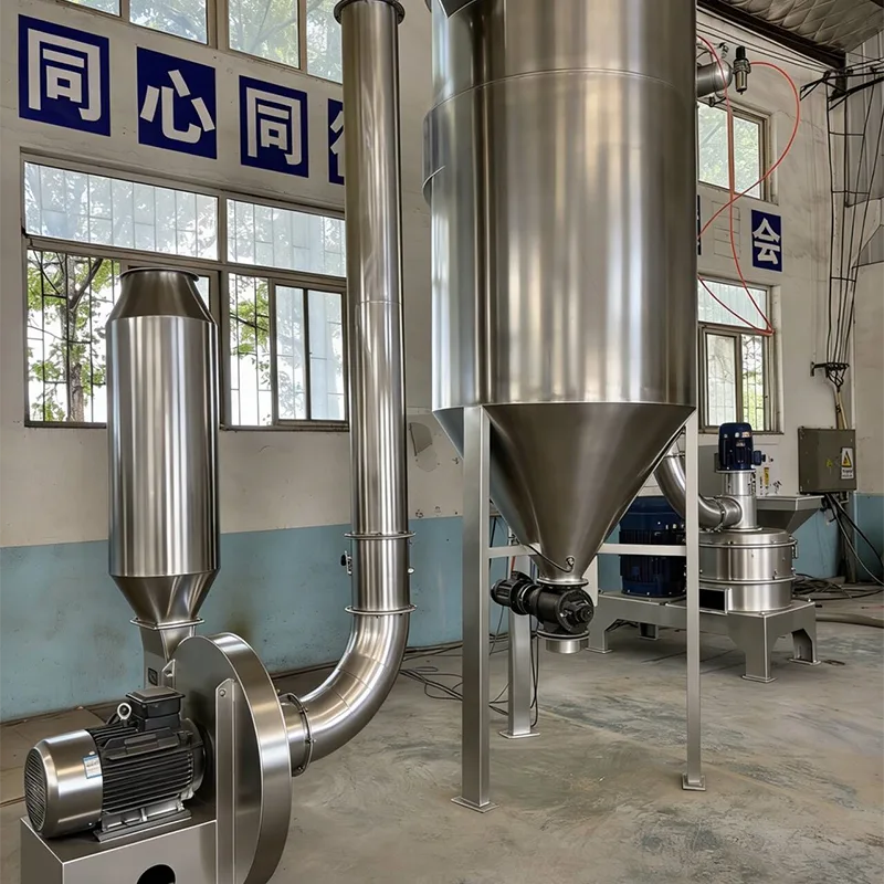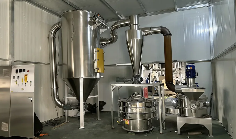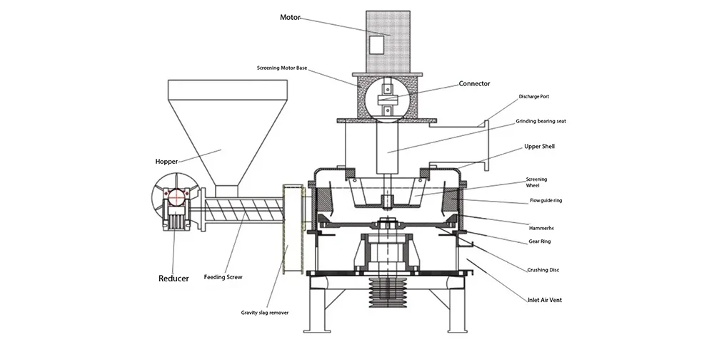Quy trình xử lý cụ thể rất đơn giản: đầu tiên, cho nguyên liệu bột thô có kích thước hạt không quá 10 mm vào phễu cấp liệu, sau đó vận chuyển đến buồng nghiền với tốc độ không đổi thông qua bộ cấp tần số thay đổi; Đĩa mài trong buồng nghiền quay với tốc độ cao, khiến búa mài và con lăn nghiền chạy đồng bộ ở tốc độ cao, tạo ra lực ly tâm mạnh và ném nguyên liệu bột thô vào thành trong của buồng nghiền; Dưới tác dụng của lực ly tâm, nguyên liệu thô trải qua các va chạm, cắt và ma sát nghiêm trọng với các tấm lót chịu mài mòn, búa nghiền và con lăn nghiền, hoàn thành quá trình nghiền sơ bộ; Sau quá trình nghiền ban đầu, vật liệu sẽ được đưa vào buồng phân loại nhờ luồng không khí áp suất âm do quạt hút cảm ứng tạo ra. Bánh xe phân loại trong buồng phân loại quay với tốc độ cao để phân loại chính xác theo kích thước hạt. Bột siêu mịn đạt yêu cầu (kích thước hạt có thể điều chỉnh khi cần thiết) sẽ được luồng khí đưa vào bộ thu để hoàn thành việc thu; Bột thô không đạt yêu cầu về kích thước hạt sẽ bị bánh xe phân loại chặn lại và đưa trở lại buồng nghiền để nghiền thứ cấp cho đến khi đạt tiêu chuẩn kích thước hạt quy định, đảm bảo độ đồng đều của bột thành phẩm.