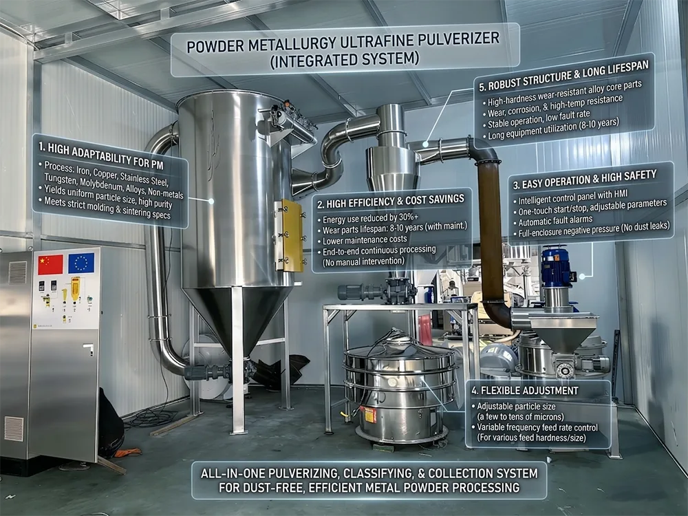 Máy nghiền siêu mịn luyện kim bột là một thiết bị chuyên dụng được phát triển dành riêng cho ngành luyện kim bột. Nó chủ yếu được sử dụng để xử lý siêu mịn bột kim loại, bột hợp kim và các nguyên liệu bột phi kim loại khác nhau, và có thể thích ứng hoàn hảo với yêu cầu xử lý nguyên liệu thô của toàn bộ quá trình sản xuất luyện kim bột. So với thiết bị nghiền thông thường, đặc điểm nổi bật nhất của máy nghiền siêu mịn luyện kim bột là tuân thủ các tiêu chuẩn nghiêm ngặt của ngành luyện kim bột, có thể kiểm soát chính xác kích thước hạt của bột, đảm bảo phân bố hạt đồng đều và tránh hoàn toàn ô nhiễm thứ cấp, đảm bảo độ tinh khiết cao của bột thành phẩm và đáp ứng đầy đủ các yêu cầu cốt lõi của quá trình tạo hình, thiêu kết và các quá trình khác tiếp theo.