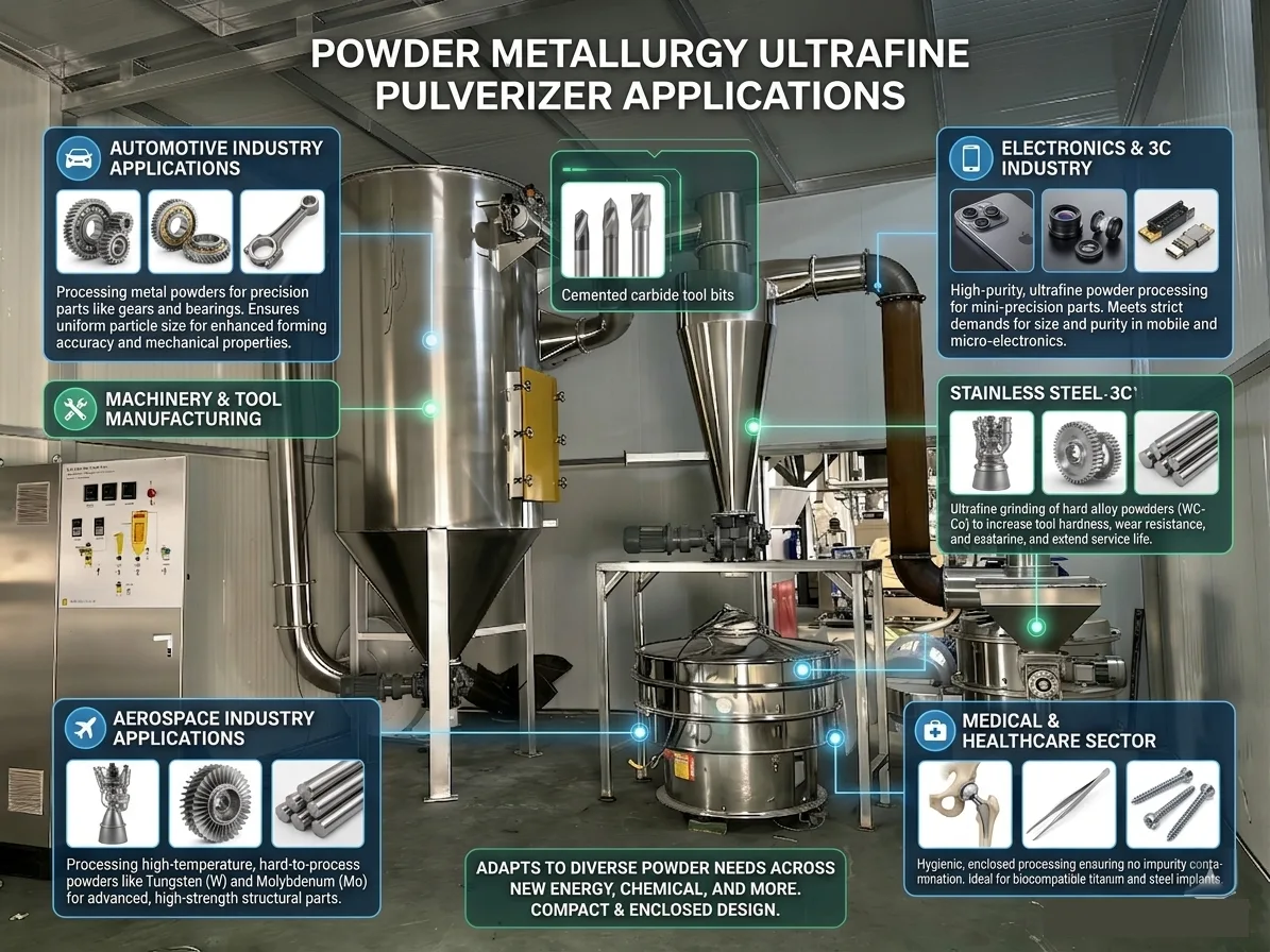 Máy nghiền siêu mịn luyện kim bột chủ yếu được sử dụng để xử lý nguyên liệu thô siêu mịn trong toàn bộ ngành luyện kim bột và có thể thích ứng với việc xử lý nghiền các loại bột kim loại, hợp kim và phi kim loại khác nhau. Nó được sử dụng rộng rãi trong nhiều lĩnh vực như ô tô, máy móc, điện tử, hàng không vũ trụ, y tế và sản xuất công cụ. Các kịch bản ứng dụng cụ thể như sau: